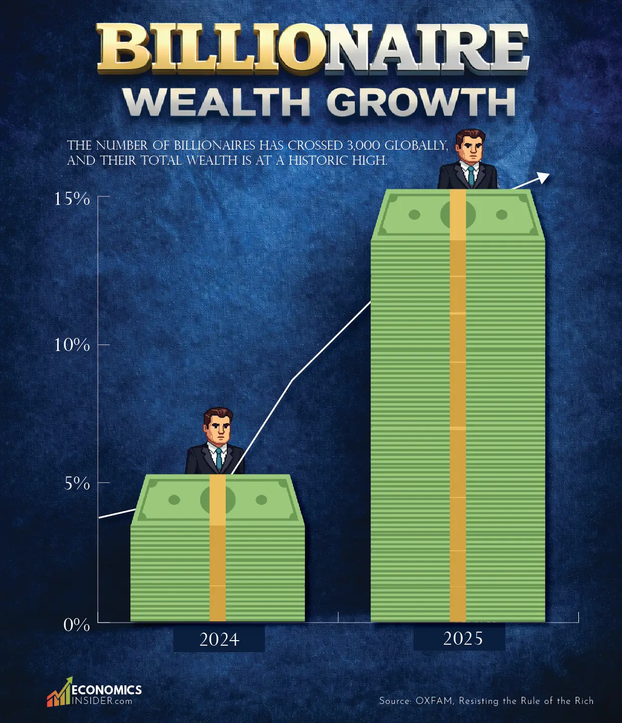 The world’s richest individuals are getting richer at a pace that is far faster than before. According to the latest Oxfam report, billionaire fortunes have grown three times faster in 2025 compared to the average annual growth rate of the previous five years.